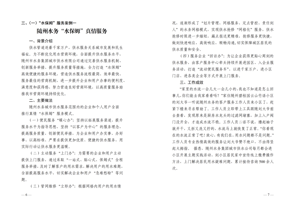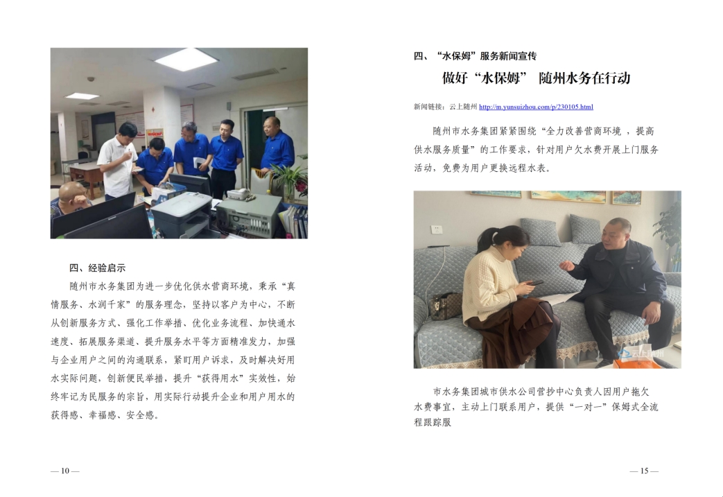 為全面提升供水服務(wù)水平,優(yōu)化供水營商環(huán)境,隨州水務(wù)集團(tuán)推出“水保姆”供水服務(wù)新模式,建立“供水服務(wù)網(wǎng)格員”隊(duì)伍,通過開展清表核查、網(wǎng)格劃分、聯(lián)合社區(qū)共同解決用戶問題等亮點(diǎn)行動(dòng),讓百姓暖心,讓企業(yè)放心。