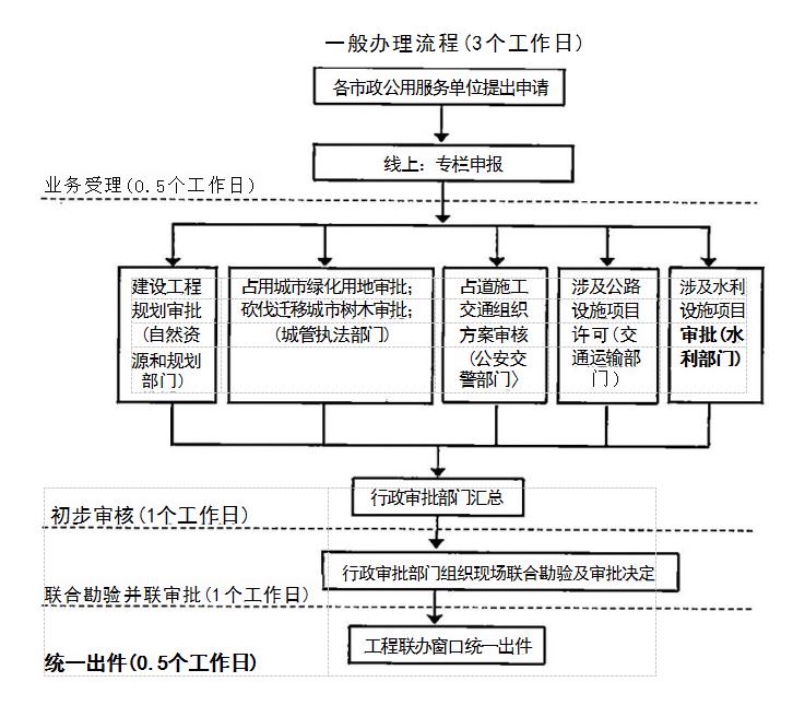 并聯(lián)審批辦理總時(shí)限:告知承諾制項(xiàng)目無需批前審批,由城 管、交通、公安審批部門加強(qiáng)現(xiàn)場實(shí)施監(jiān)管;一般審批項(xiàng)目3個(gè) 工作日(不含方案和評價(jià)報(bào)告編制時(shí)間、方案評審時(shí)間、申請人修改、審批前公示或公證時(shí)間)。